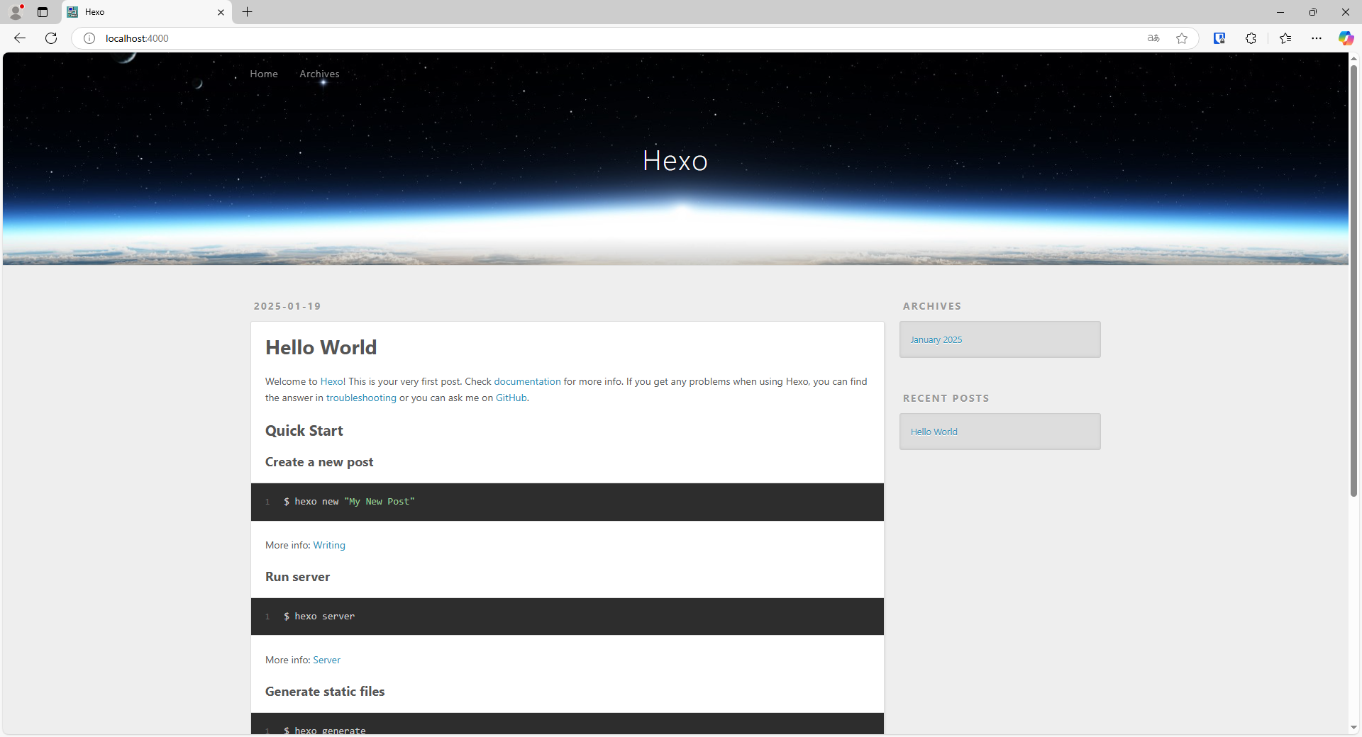 该网站包含了Hello World页面,以及一些在该主题下的基本操作。这对我们来说远远不够,因为这样的网站发布出去,你的读者就会认为你的能力大概就如此了(虽然已经超越了大多数的用户)。首先,第一眼,就知道你是用Hexo搭建的个人静态博客(但至少比WordPress操作要更装B,安装软件不用图形化界面,系统资源消耗更少,底层原理也更低级,无数据库,无后端😁)。即使你改了标题,看这样式和背景图片也猜得到你是怎么搭建的。而且,你这页面如果发布出去,大概只是几万人当中的一分子,默认主题,给人一种网站跑路了的感觉。