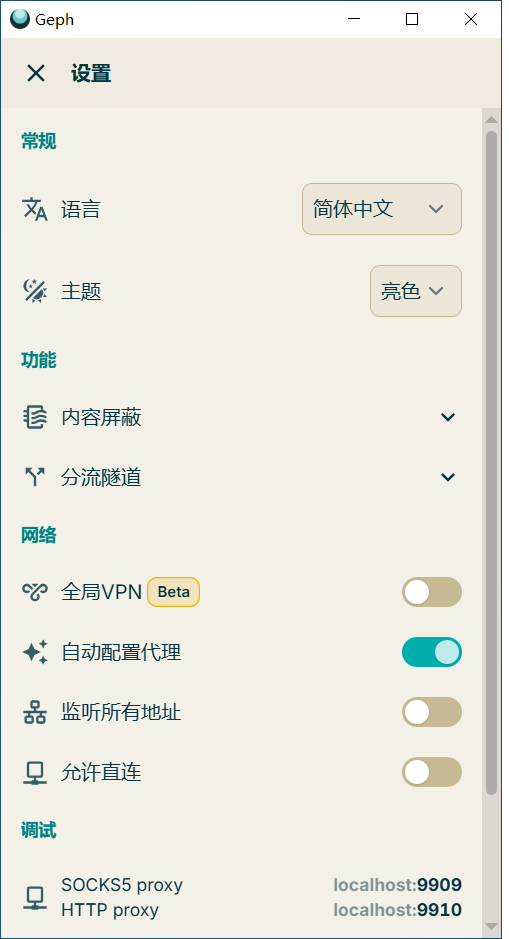 其实此时并不需要更改配置,它会自动连接迷雾通网络,并且开启入口。给电脑配置代理,让所有能使用代理的软件指向localhost:9909和localhost:9910两个代理地址。浏览器即可翻墙,除非你没有让浏览器使用系统代理,而是不使用代理,或者单独使用其他代理配置。