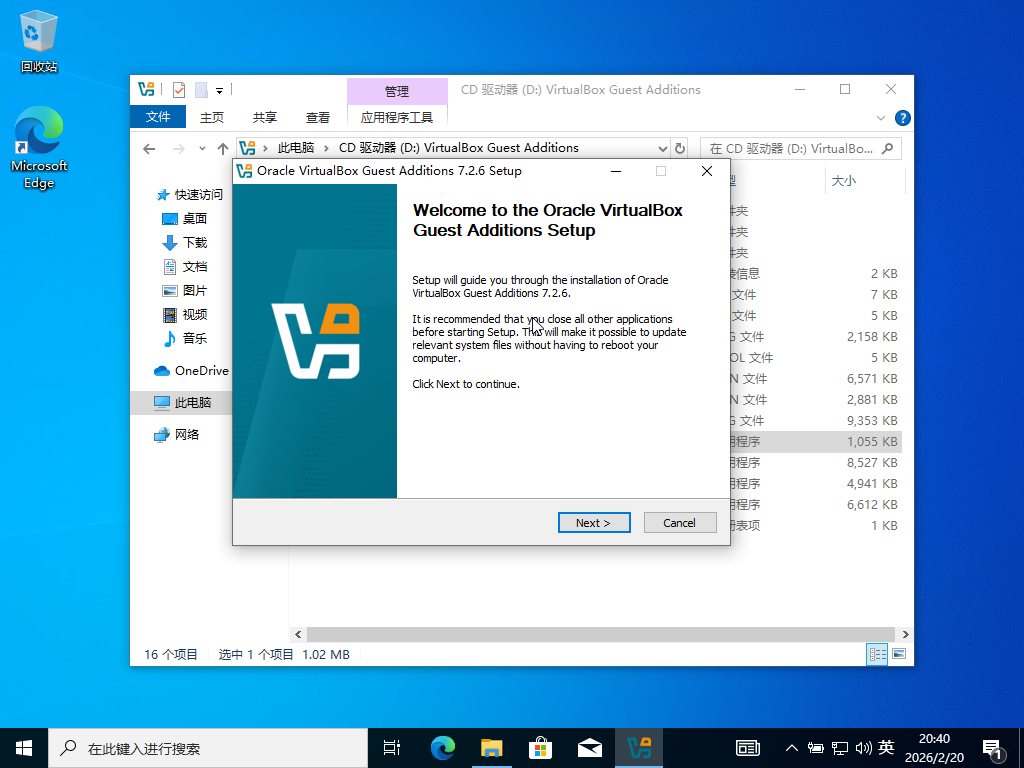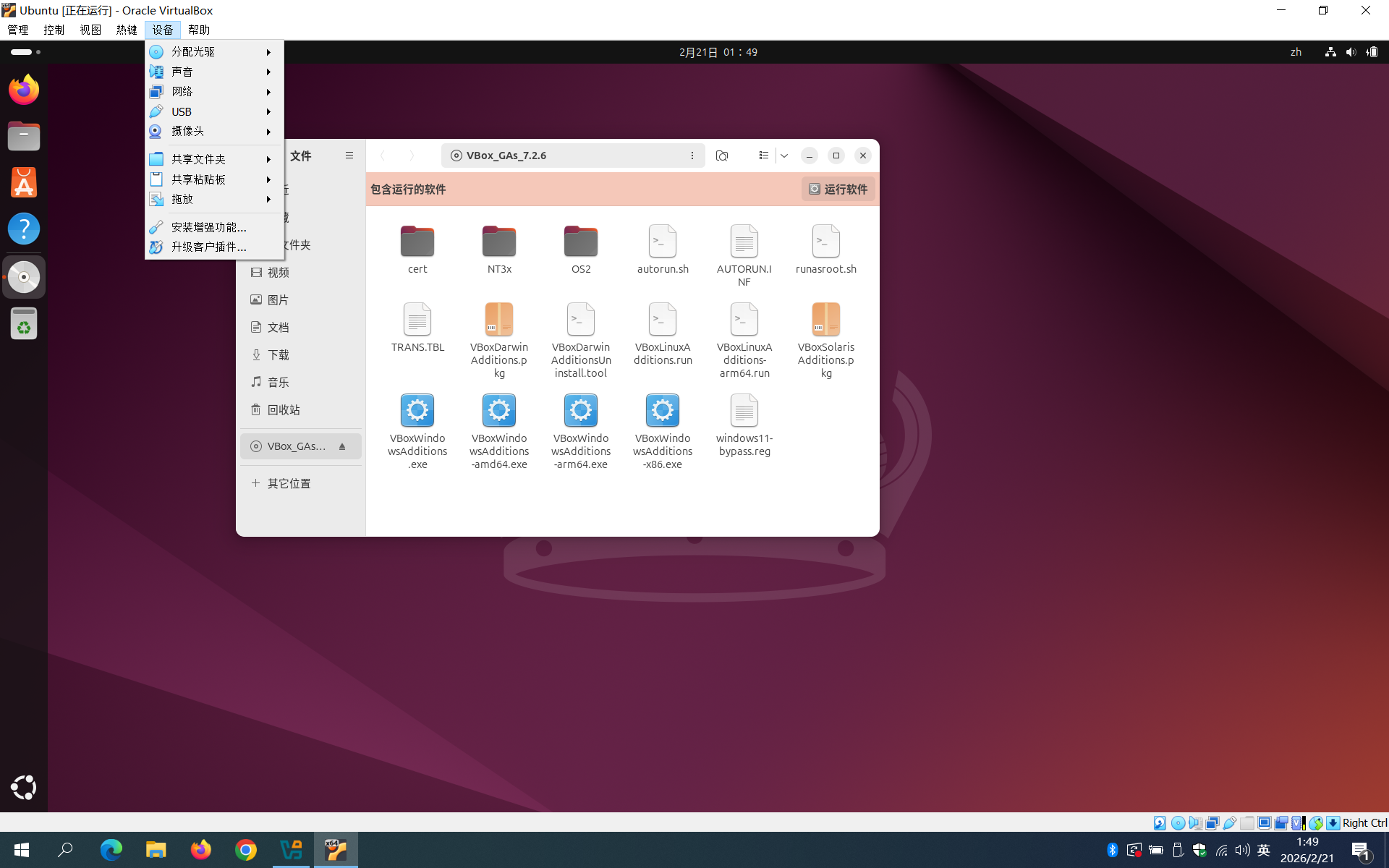 首先,单击设备>安装增强功能,将虚拟机光驱加载的文件切换为增强工具安装包。
