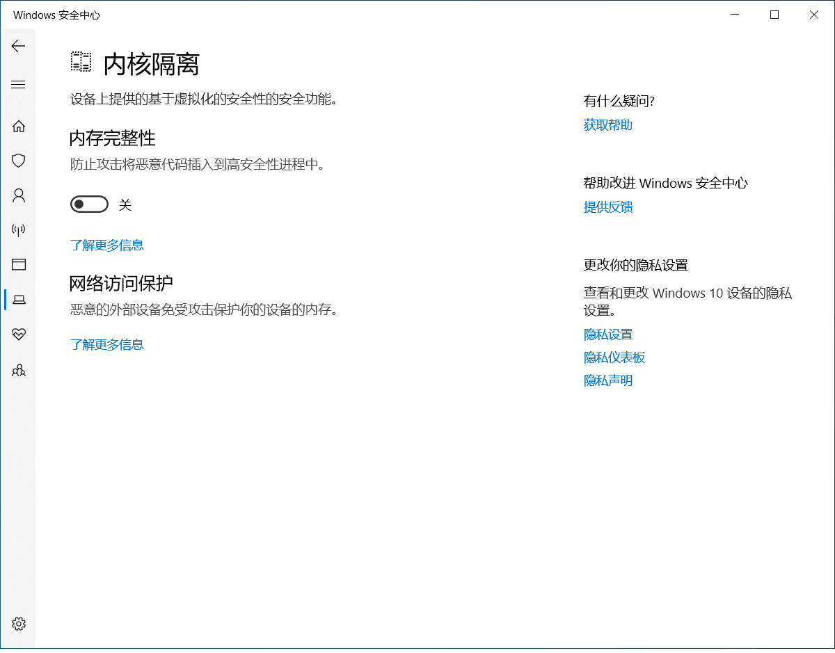 打开内核隔离,关闭内存完整性,必要时重启