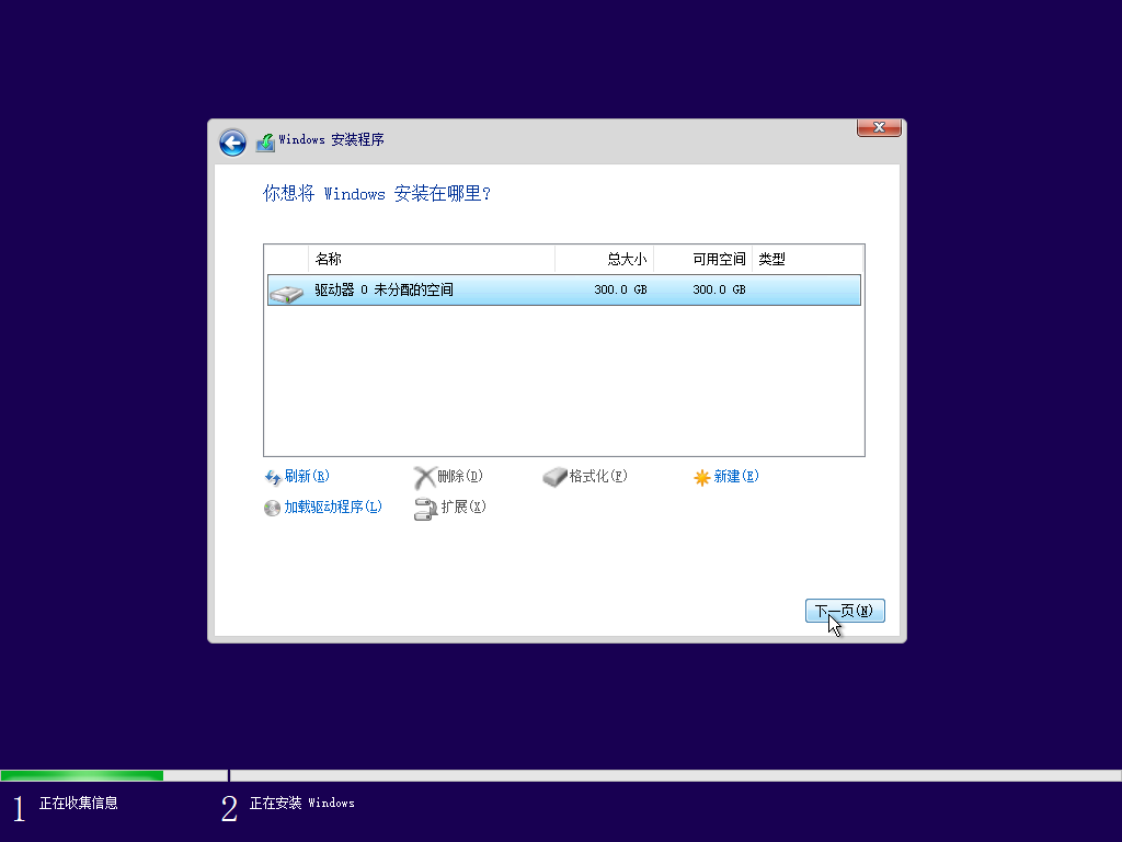 这里只有一个盘,无需分区,直接点下一页即可。如果这个盘里面有其他分区,那么就需要在这里手动分区。